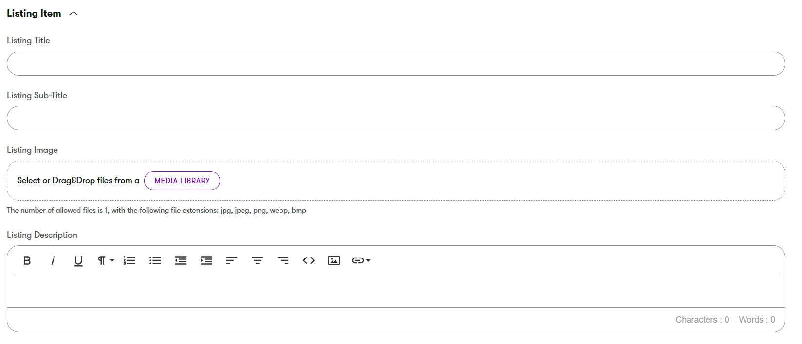 - Fill out the Listing Item fields: